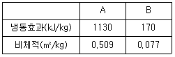 냉동기 속 두 냉매가 아래 표의 조건으로 작동될 때, A 냉매를 이용한 압축기의 냉동능력을 QA, B 냉매를 이용한 압축기의 냉동능력을 QB인 경우 QA/QB의 비는? (단, 두 압축기의 피스톤 압출량은 동일하며, 체적효율도 75%로 동일하다.)