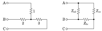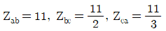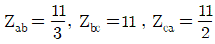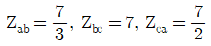 그림과 같은 Y결선 회로와 등가인 △결선 회로의 Zab, Zbc, Zca값은?