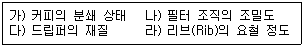 핸드 드립으로 같은 양의 커피를 추출할 때, 다음 중 추출 속도에 영향을 미치는 요소가 아닌 것은?
