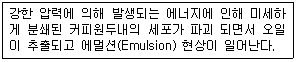 아래 내용은 에스프레소 추출 시 일어나는 현상에 대한 설명이다. 여기서 말하는 에멀션(Emulsion)현상은 무엇인가?