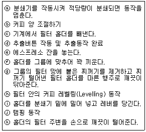 다음 은 에스프레소 추출 동작들이다. 올바른 순서대로 정렬한 것은?