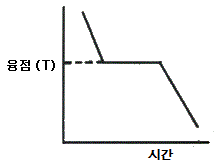 [그림]은 순금속의 냉각 곡선이다. 융점에서 수평을 이루는데 여기서 Gibbs의 상률을 적용한 자유도(E)는? (단, 압력이 일정하다.)