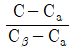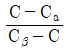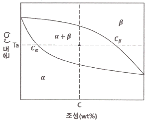 그림과 같은 상태도를 가진 2성분계에서 C조성을 가진 합금을 평형 냉각하여 온도 Ta에 이르렀을 때 β상과 α상의 중량비(β/α)는? (단, Ca는 온도 Ta에서 α상의 조성 Cβ는 온도 Ta에서 β상의 조성)