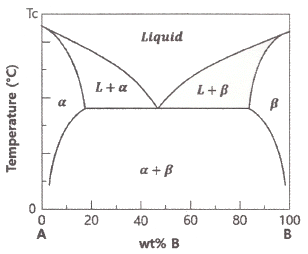 다음 상태도에서 70wt%A-30wt%B인 합금을 Tc온도까지 열을 가한 뒤 0℃까지 냉각시켰을 때, 합금의 조직은?