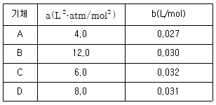 다음은 A, B, C, D 기체의 반데르발스 상수값(a, b)을 각각 나타낸 것일 때, 다음 중 임계온도가 가장 높은 기체는?