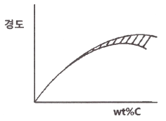 탄소의 고농도 부근에서 마텐자이트의 경도가 탄소의 농도에 비례하여 직선적으로 증가하지 못하는 이유는?