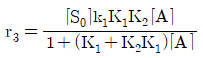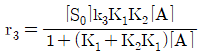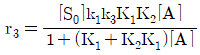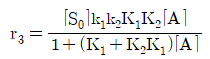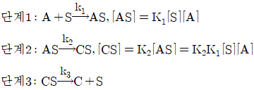 A→C의 촉매반응이 다음과 같은 단계로 이루어진다. 탈착반응이 율속단계일 때 Langmuir Hinshelwood모델의 반응속도식으로 옳은 것은? (단, A는 반응물, S는 활성점, AS와 CS는 흡착 중간체이며, k는 속도상수, K는 평형상수, SO는 초기 활성점, [ ]는 농도를 나타낸다.)