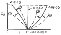 그림은 단열 조작에서 에너지수지식의 도시적 표현이다. 발열반응의 경우 불활성 물질을 증가시켰을 때 단열 조작선은 어느 방향으로 이동하겠는가? (단, 실선은 불활성 물질이 없는 경우를 나타낸다.)