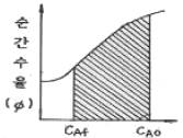 다음 그림의 사선 부분은 생성물을 최대로 하였을 때의 반응 형태이다. 이 반응에 가장 적합한 반응기의 종류는? (단, CAO는 초기(또는 공급물) 농도이고, CAf는 최종(또는 출구) 농도이다.)