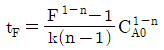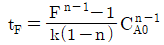 회분식 반응기에서 반응시간이 tF일 때 CA/CA0의 값을 F라 하면 반응차수 n과 tF의 관계를 옳게 표현한 식은? (단, k는 반응속도상수 이고, n≠1 이다.)