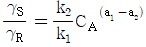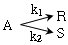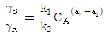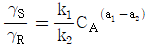 다음 반응에서 생성속도의 비를 가장 정확하게 나타낸 식은? (단, k1, k2는 각 경로에서의 속도상수이고 각각의 반응 차수는 a1, a2이다.)