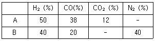 암모니아 합성을 위한 CO가스 전화공정에서 다음과 같은 조성의 A, B 두 가스를 사용할 때 A 가스 100 에 대하여 B 가스를 얼마의 비로 혼합하면 암모니아 합성원료로 적합할 수 있는가? (단, CO 전화 반응효율은 100%로 가정한다.)