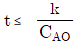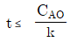 정용 회분식 반응기에서 단분자형 0차 비가역 반응에서의 반응이 지속되는 시간 t의 범위는? (단, CAO는 A성분의 초기농도, k는 속도상수를 나타낸다.)