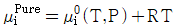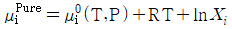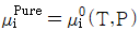 두성분이 완전 혼합되어 하나의 이상용액을 형성할 때 한성분 i의 화학포텐셜 μi는 μ°(T,P)+RTㆍlnXi으로 표시할 수 있다. 동일 온도와 압력하에서 한성분 i의 순수한 화학포텐셜 μipure는 어떻게 나타낼수 있는가? (단, Xi는 i성분의 몰분율, μ°(T,P)는 같은 T와 P에 있는 이상용액상태의 순수성분 i의 화학 포텐셜이다.)
