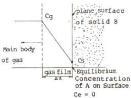 기체 - 고체 비균일상 반응의 농도 분포 곡선이 다음 그림과 같으면, 이 때 반응속도의 율속 단계는 어떤 단계인가?