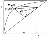 다음 x-y 도표에서 최소 환류비를 결정하기 위한 농축부 조작선은 어느 것인가?