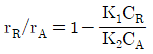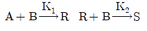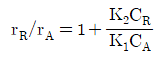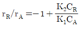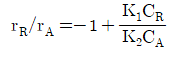 다음과 같은 반응이 일정한 밀도에서 비가역적이고, 2분자적(bimolecular)으로 일어난다. 이 때 R과 A의 반응속도식의 비 rR/rA를 옳게 나타낸 것은? (단, R은 목적하는 생성물이고, S는 목적하지 않은 생성물이다.)