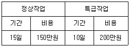 어떤 공장에서 작업을 하는데 있어서 소요되는 기간과 비용이 다음 표와 같을 때 비용구배는? (단, 활동시간의 단위는 일(日)로 계산한다.)
