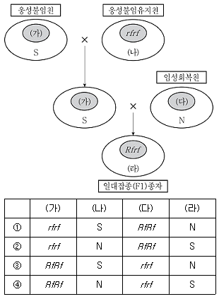 다음 그림은 세포질-유전자적 웅성불임성(CGMS)을 이용한 일대잡종(F1)종자 생산체계이다. (가)~(라)에 들어갈 핵과 세포질의 유전조성을 바르게 연결한 것은? (단, S는 웅성불임세포질, N은 웅성가임세포질, Rf는 임성회복유전자이다.)