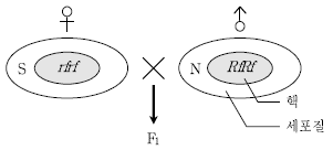 다음은 세포질-유전자적 웅성불임성에 대한 내용이다. F1의 핵과 세포질의 유전자형 및 표현형으로 옳게 짝 지은 것은? (단, S는 웅성불임성 세포질이고 N은 가임 세포질이며, 임성회복유전자는 우성이고 Rf며, 임성회복유전자의 기능이 없는 경우는 열성인 rf이다) (순서대로 핵의 유전자형, 세포질의 유전자형, 표현형)
