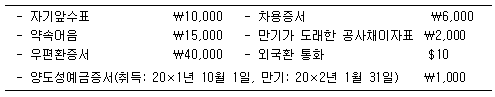 다음 (주)한국의 20×1년 말 항목 중 재무상태표상 현금및현금성자산의 합계액은? (단, 외국환 통화에 적용될 환율은 $1=₩1,100이다.)