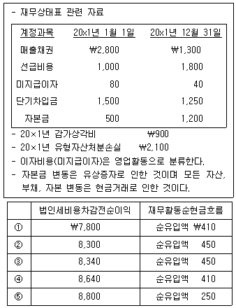 (주)한국의 20×1년 영업활동 순현금유입액은 ₩12,000이다. 다음 자료를 이용할 때, 20×1년 법인세비용차감전순이익과 재무활동순현금흐름으로 옳은 것은?