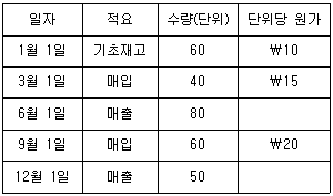 다음은 (주)한국의 20×1년도 재고자산의 매입과 매출 관련 거래내역이다. 실지재고조사법에 의한 가중평균법을 적용할 경우 매출원가는? (단, 재고자산감모손실과 평가손실은 없다.)
