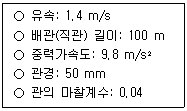 다음과 같은 조건의 배관에서 마찰손실수두(mAq)는? (단, Darcy-Weisbach 공식을 사용함)