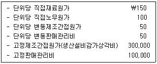 (주)한국은 연간 최대 5,000단위의 제품을 생산할 수 있는 생산설비를 보유하고 있다. (주)한국은 당기에 4,000단위의 제품을 기존 거래처에 단위당 \500에 판매할 수 있을 것으로 예상하고 있으며, 영업활동에 관한 자료는 다음과 같다.