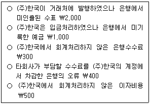 (주)한국이 은행으로부터 통지받은 은행 예금잔액증명서 상 잔액은 ₩10,000이고, 장부상 당좌예금 잔액과 차이가 있다. 당좌예금계정 잔액의 불일치 원인이 다음과 같을 때, (주)한국의 조정 전 당좌예금 계정 잔액은?