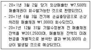 (주)한국의 20×1년 초 매출채권에 대한 손실충당금 \5,000이다. 매출채권과 관련된 자료가 다음과 같을 때, 20×1년도에 인식할 손상차손은?
