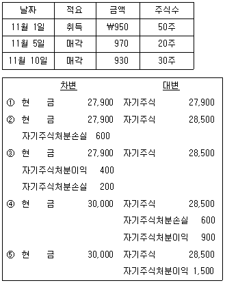 (주 )한국은 다음과 같이 액면가 \1,000인 자기주식을 취득하여 매각하였다. 11월 10일 매각 시점의 분개로 옳은 것은?