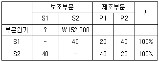 (주)한국은 두 개의 보조부문(S1, S2)과 두 개의 제조부문(P1, P2)으로 제품을 생산하고 있다. 각 부문원가와 용역수수관계는 다음과 같다.