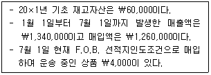 (주)한국은 20×1년 7월 1일 홍수로 인해 창고에 있는 상품재고 중 30%가 소실된 것으로 추정하였다. 다음은 소실된 상품재고를 파악하기 위한 20×1년 1월 1일부터 7월 1일까지의 회계자료이다. (주)한국의 원가에 대한 이익률이 25%일 때 소실된 상품재고액은?