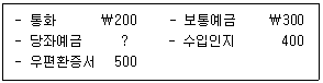 (주)한국의 20×1년 말 재무상태표에 표시된 현금및현금성자산은 \4,000이었다. 다음 자료를 이용할 경우 당좌예금은?