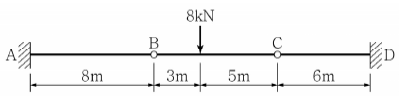 그림과 같이 경간 사이에 두 개의 힌지가 있으며, 8kN의 집중하중을 받는 양단 고정보가 있다. 이 보의 A, D지점에 발생하는 휨모멘트는? (순서대로 A, D)