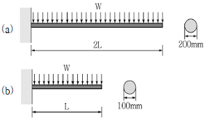 그림과 같이 등분포하중(W)을 받는 캔틸레버 보의 길이와 단면이 (a) 및 (b)의 두 가지 조건으로 주어졌을 경우 두 보의 최대 처짐비로 옳은 것은?