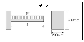 <보기>와 같은 단면을 갖는 캔틸레버 보에 작용할 수 있는 최대 등분포하중(W)은? (단, 내민길이 l=4m, 허용전단응력 fs=2MPa이고 휨모멘트에 대해서는 충분히 안전한 것으로 가정한다.)