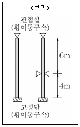 <보기>와 같이 1단고정, 타단 핀고정이고 절점 횡이동이 없는 중심압축재가 있다. 부재단면은 압연H형강이고, 부재길이는 10m, 부재 중간에 약축 방향으로만 횡지지(핀고정)되어 있다. 이 부재의 휨좌굴강도를 결정하는 세장비로 가장 옳은 것은? (단, 부재단면의 국부 좌굴은 발생하지 않으며, 세장비는 유효좌굴길이(이론값)를 단면2차반경으로 나눈 값으로 정의하고, 강축에 대한 단면2차반경 rx=100mm, 약축에 대한 단면2차반경 ry=50mm이다.)