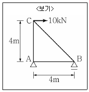 <보기>와 같은 단순트러스 구조물 C점에 수평력 10kN이 작용하고 있다. 부재 BC에 걸리는 힘의 크기 FBC 값은? (단, 인장력은 (+), 압축력은 (-)이다.)