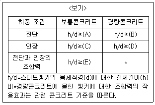 <보기>의 매입형 합성부재 안에 사용하는 스터드앵커에 관한 표에서 A~E 중 가장 작은 값과 가장 큰 값을 순서대로 바르게 나열한 것은? (단, 표는 각 하중조건에 대한 스터드앵커의 최소 h/d 값을 나타낸 것이다.)