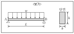 <보기>와 같이 등분포 하중 ω를 지지하는 스팬 L인 단순보가 있다. 이 보의 단면의 폭은 b, 춤은 h라고 할 때, 최대 휨모멘트로 인해 이 단면에 발생하는 최대 인장응력도의 크기는?