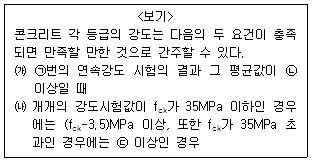 시험실에서 양생한 공시체의 강도평가에 대한 <보기>의 설명에서 ㉠~㉢에 들어갈 값을 순서대로 바르게 나열한 것은? (순서대로 ㉠, ㉡, ㉢)