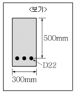 <보기>와 같은 단면을 갖는 직사각형 보의 인장철근비는? (단, D22 철근 3개의 단면적 합은 600mm2이다.)
