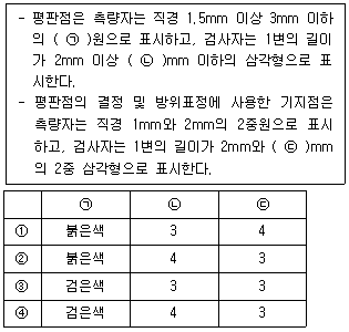 <보기>는 「지적업무처리규정」상 평판측량방법 또는 전자평판측량방법으로 세부측량을 하는 때에 측량준비파일에 측량한 기하적 작성에 대한 내용이다. <보기>의 ㉠~㉢에 들어갈 사항을 옳게 짝지은 것은?