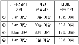 「GNSS에 의한 지적측량규정」에 따라 GNSS측량기를 사용하여 정지측량방법으로 지적도근점측량을 실시하고자 한다. 이때 기지점과의 거리, 세션 관측시간, 데이터 취득간격을 순서대로 바르게 나열한 것은?