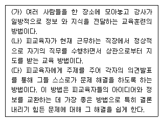 다음 교육훈련 방법으로 (가), (나), (다)에 모두 맞는 것은? (순서대로 가, 나, 다)