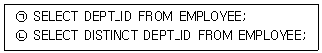 총 6개의 튜플을 갖는 EMPLOYEE 테이블에서 DEPT_ID 필드의 값은 “D1”이 2개, “D2”가 3개, “D3”가 1개로 구성되어 있다. 다음 SQL문 ㉠, ㉡의 실행 결과 튜플 수로 옳은 것은?