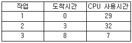 SJF(Shortest Job First) 스케줄링에서 작업도착시간과 CPU 사용시간은 다음 표와 같다. 모든 작업들의 평균 대기시간은 얼마인가?
