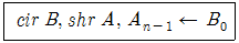 n bit의 레지스터 A(An-1An-2…A1A0)와 B(Bn-1Bn-2…B1B0)에 대해 다음의 마이크로 오퍼레이션(micro-operation)을 n번 수행하였다. 이 마이크로오퍼레이션의 기능으로 가장 적합한 것은?(단, shr은 오른쪽 시프트(right shift), cir은 오른쪽 회전 시프트(rotate right)이다.)